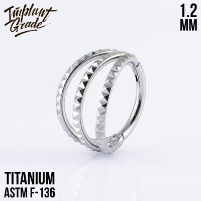 Кольцо-кликер из титана марки ASTM F-136. Двойное кольцо, каждая линия украшена с внешней стороны рядом прозрачных кристаллов фианита. Ширина расходящейся части: 4-5 мм. Зеркальная полировка.